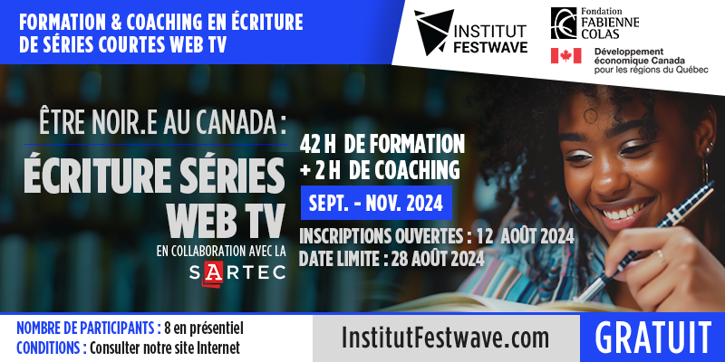 À la demande générale et constatant l’absence presque totale de scénaristes afro-descendants dans l’audiovisuel au Canada, l’Institut Festwave de la Fondation Fabienne Colas lance un nouvel atelier de formation gratuit sur l’écriture de série courtes de fiction (Web et TV). Cette formation, qui découle de l’incubateur Être Noir.e au Canada de la Fondation Fabienne Colas, présenté par Netflix en collaboration avec la Banque Nationale, a pour but d’accélérer l’inclusion massive d’artistes noir.e.s derrière la caméra au Canada.